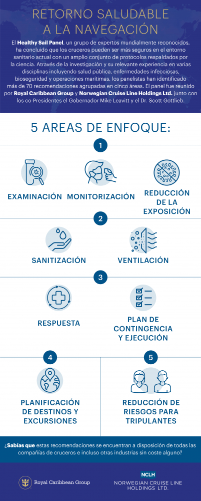 A través de la investigación y su relevante experiencia en varias disciplinas, que incluyen salud pública, enfermedades infecciosas, bioseguridad y operaciones marítimas, los panelistas han identificado más de 70 recomendaciones agrupadas en cinco áreas. El panel fue reunido por Royal Caribbean Group y Norwegian Cruise Line Holding Ltd junto con los co-Presidentes, el Gobernador Mike Leavitt y el Dr. Scott Gottlieb.